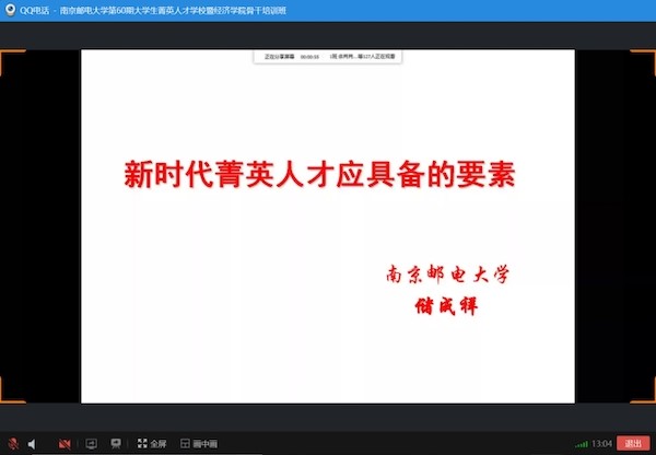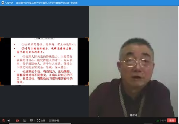 2020年5月10日,南京邮电大学第六十期菁英人才学校暨经济学院学生骨干培训班第十六课在线上平台顺利举行。本次课程由校关工委副主任、经济学院关工委副主任储成祥教授主讲,主题为《新时代菁英人才应具备的要素》。