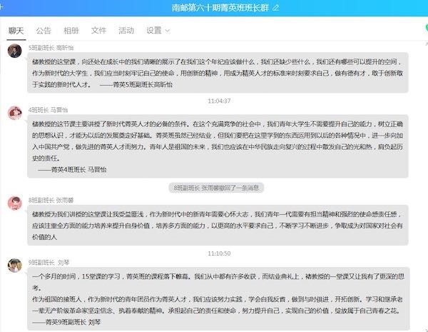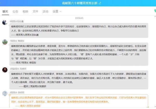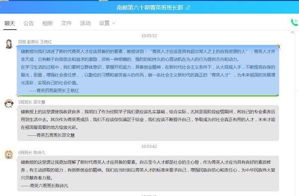 经济学院2018级兼研究生辅导员王珏表示,储教授的云端思政课结合当前国内外疫情形势,内涵丰富,循循善诱,着重培养青年学子的家国情怀和社会责任感,激励大家将个人的青春梦想和祖国的高速发展紧密相连,争做勇于担当,敢于拼搏的新时代青年,储教授的课程引发了经院学子的热烈反响,与当前学生思想政治教育工作保持高度一致。对于青年辅导员,储教授的课程不仅是学院思政工作的助力,也为他们今后的工作和学习指点了方向。2019级学生邵文慧从课堂中获益良多,明白了应该将专业知识和现实需求相结合,学以致用,成为对社会有贡献的人才。2018级学生王艳红对于储教授提出的“菁英人才应该是具有超出常人之上的自我资源的人”这句话记忆犹新,她认为,菁英人才是对于自我信念的坚持,是一种明确的、强烈的、持久的内在心理动机,是不断提升自身眼光、胆量、视野的人生追求。2018级学生高昕怡上完这堂课后,一直在思考我们青年大学生应该做什么,还缺少什么,还有哪些可以提升的空间,如何成为符合现代标准的菁英人才。储教授提到的古语“修业必先修德” 点醒了2019级学生穆昱彤,她领悟到,只有“修德”,以“德”引领,德才相配,才能成为社会发展所需要的人,才能担负起社会的重任。