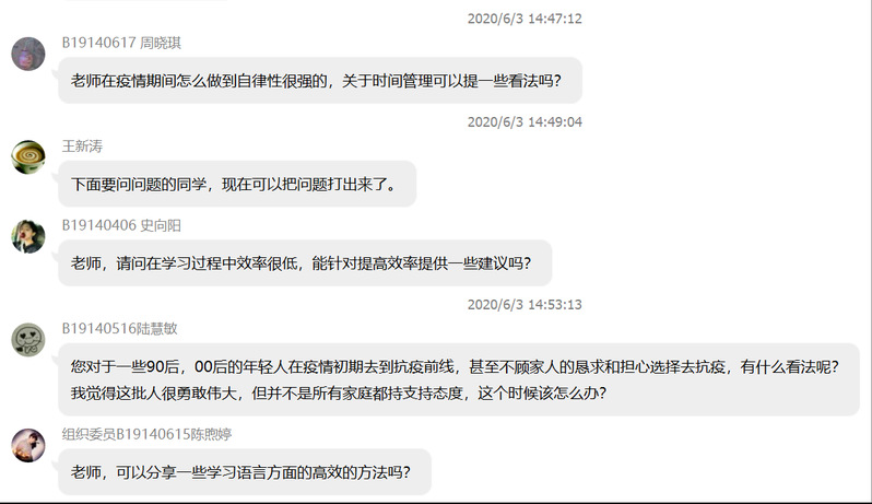 讲座的最后,同学们就如何看待青年大学生的抗疫志愿服务活动、如何在居家封闭期间提升学习效率和处理与父母的代沟等问题,与何老师展开了交流。通过何老师的分享,同学们加深了对中国疫情防控形势的了解和对国家的热爱,对如何适应疫情防控常态化下的生活和学习有了更多的思考,大家共同期待早日战胜疫情!