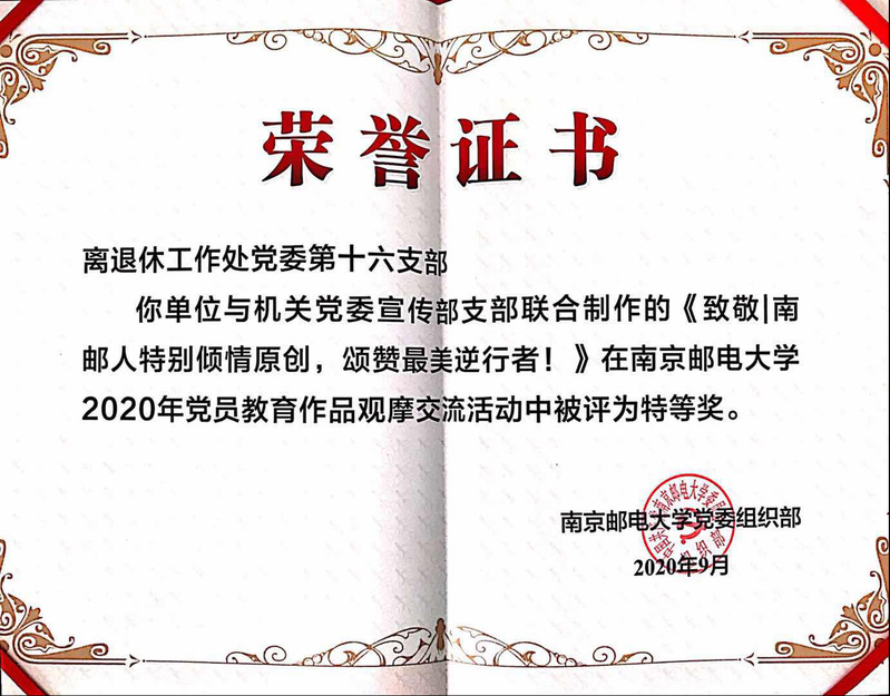 近日,由学校党委组织部举办的南京邮电大学2020年党员教育作品观摩交流活动落下帷幕,经过评审,离退休工作处党委第十六支部与机关宣传部支部联合制作的《致敬|南邮人特别倾情原创,颂赞最美逆行者!》作品获特等奖。
