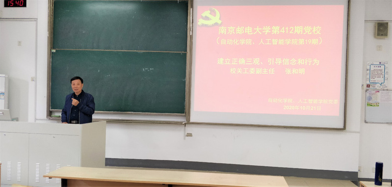 2020年10月21日,自动化学院、人工智能学院第19期入党积极分子专题讲座《建立正确三观,引导信念和行为》在仙林校区教学楼教2-203会议室举行,本次讲座由校关工委副秘书长张和明老师主讲。