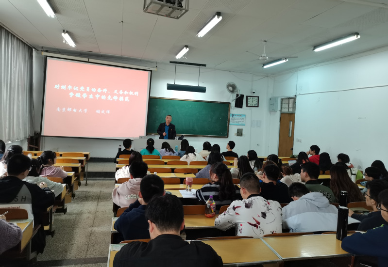 接着,储教授分别围绕“条件、义务与权利的解读”“义务权利之间的关系”“大学生如何做先锋模范”三方面内容进行详尽阐释。他指出,党员在履行义务和行使权利时都具有鲜明党性,“没有无义务的权利,也没有无权利的义务”。党员的义务和权利之间是相辅相成的关系,互为条件。他强调,入党积极分子要在学生中发挥先锋模范作用,树立远大的共产主义理想,努力提高自身的品行修养与理论水平,完成好自己的学习任务,并且要融入到同学中去,互帮互学、共同进步。他勉励各位同学“学到老、活到老、改造到老”,不断提高理论修养和专业水平,提高热爱集体、乐于奉献的自觉性,为国家发展建设贡献个人力量。