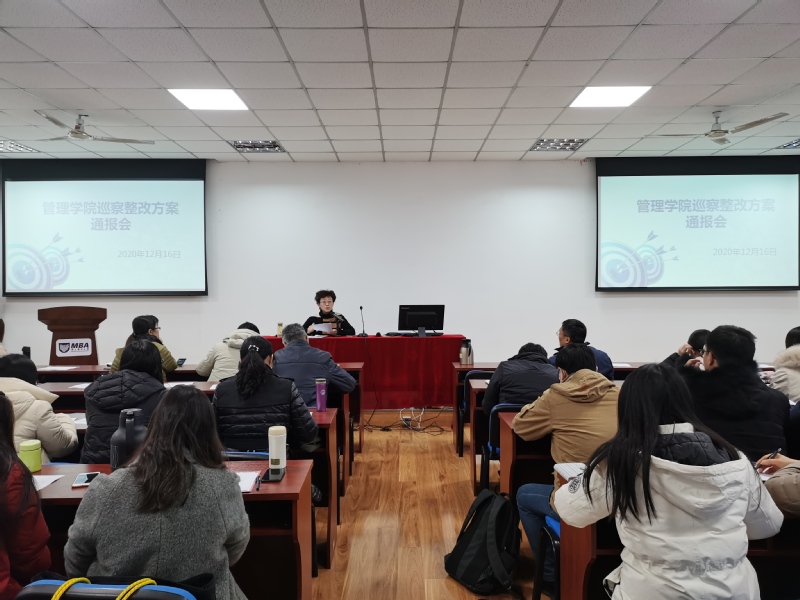 2020年12月16日下午,管理学院在图科楼三楼MBA中心会议室召开巡察整改方案专题通报会,院全体领导干部、各党支部、各系部、学术委员会、办公室、分团委、民主党派、高层次无党派人员代表参加本次会议,校关工委副主任江森老师受邀参加,会议由学院党委书记朱清主持。