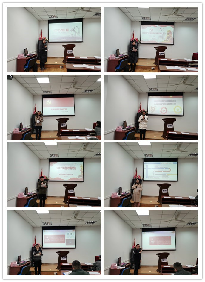 各党支部书记分别从支部基本情况、“三会一课”开展情况、党建和政治学习情况、支部活动组织开展情况、支部党员发展情况、支部获得成绩、亮点及问题和展望等方面对2020年工作开展情况进行了述职。本次述职,每位支部书记都做了充分准备,采用PPT展示的方式,图文并茂的汇报了本支部一年来工作的收获,找出了工作中的不足,提出了新的一年工作打算。