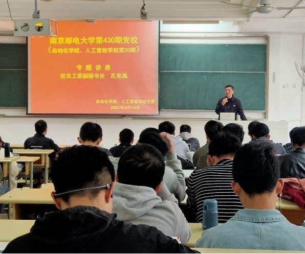 2021年4月14日下午,自动化学院、人工智能学院党委在教2-102开展了“学习党史,牢记使命,做合格党员”第20期党校专题讲座。本次讲座特邀校关工委副秘书长孔宪禹老师主讲,培训班全体学员参加了此次专题培训。