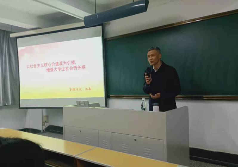 2021年4月15日晚19:00,管理学院特邀校关工委副主任江森老师在教东204教室讲述《以社会主义核心价值观为引领,增强大学生社会责任感》主题党课。管理学院第十五期入党积极分子培训班全体学员参加本次党课。