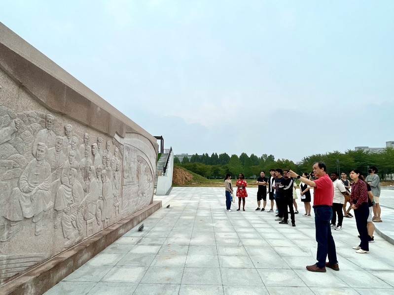 战邮广场的红色信鸽映照着教师教书育人的初心,也映照着一代代柚子研精毕智的追求。宗平教授带领中外学子参观战邮广场,回顾80年峥嵘校史,解读浮雕背后的故事,为同学们上了一堂生动特殊的校史教育课。宗平教授表示,“南邮的发展离不开一代代革命前辈的努力,更离不开新时代‘柚子’的奋斗。如今我们拥有更优质的条件,更广阔的国际舞台,作为新一代南邮人,更要肩负起新时代、新征程的历史使命,赓续‘信达天下,自强不息’的南邮精神,创造更辉煌的成就”。