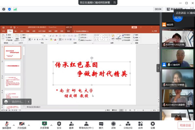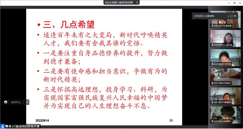 9月14日上午,经济学院开展2022级新生校史校情专题教育。会议邀请了校、院两级关工委副主任储成祥教授,储教授以“传承红色基因,争做新时代精英”为主题为新生作校史校情专题讲座。会议由经济学院2022级本科生辅导员储宜旭老师主持,2022级全体本科236名新生线上参会。