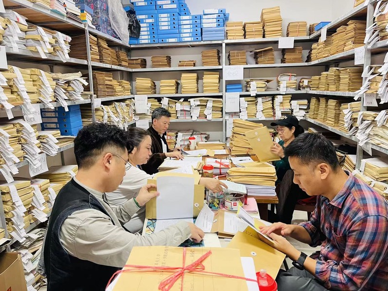 在档案室,宋老师和副院长余洋、学院教学督导组成员一起认真检查试卷、毕业设计等教学档案,宋老师仔细地列出问题清单,严格把关,并向年轻老师耐心讲解需要改进之处。