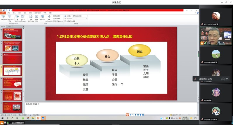 10月24日,为落实党的二十大精神,传媒与艺术学院关工委邀请校关工委江森老师为170名大二同学开设了“以社会主义核心价值观为引领 增强大学生社会责任感”在线专题讲座,这也是学院关工委在强化疫情防控期间举办“关爱关切、暖心暖生”特色系列活动之一。讲座由院党委书记李大伟主持。