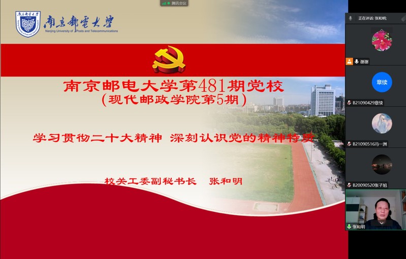 为深入学习贯彻党的二十大精神,提高入党积极分子对党的精神特质的深刻理解, 11月3日下午,现代邮政学院邀请校关工委副秘书长张和明老师为全体入党积极分子讲授“学习贯彻二十大精神,深刻认识党的精神特质”为主题的专题党课。此次党课于线上平台举行,学院第五期入党积极分子共计30余人参加了党课。