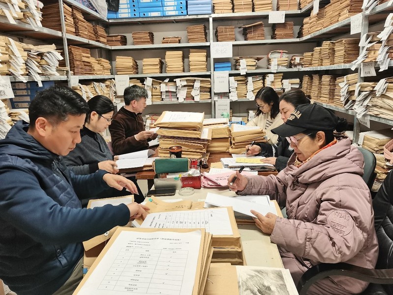 在档案室,宋老师和副院长余洋、学院教学督导组成员一起认真检查试卷、毕业设计等教学档案,宋老师仔细地列出问题清单,严格把关,并向年轻老师耐心讲解需要改进之处。