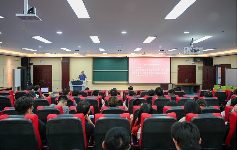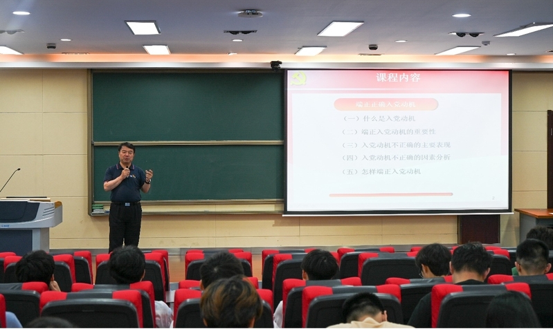 于景宝副书记讲授《坚定理想信念,端正入党动机》专题党课,向同学们介绍了正确的入党动机,阐明了端正入党动机的重要性,讲述了优秀党员的事迹。最后,于书记从学习研读党章、提高对党的认识、自觉加强党性修养和锻炼三点讲解了如何端正入党动机,并勉励同学们早日从思想上、行为上真正入党!