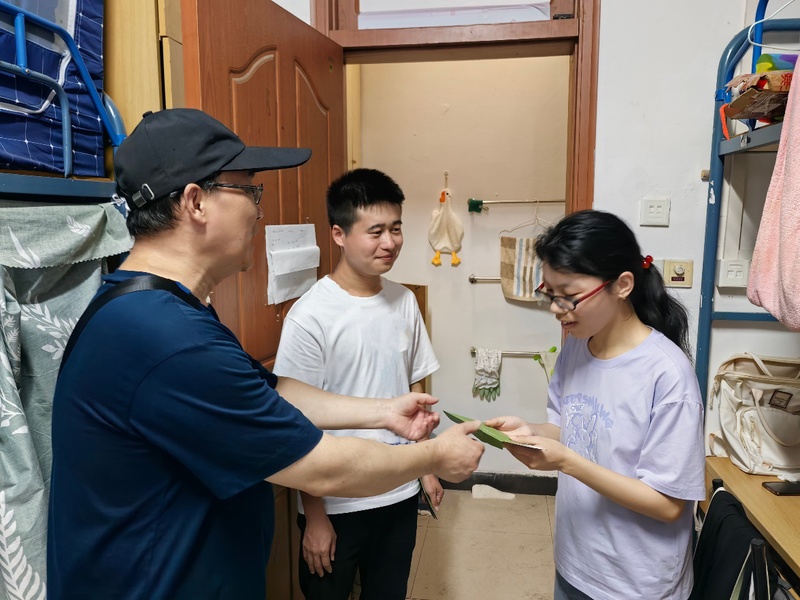 随后,盛老师来到学院家庭经济困难学生的宿舍。他关心地询问了同学们近期的家庭经济情况、亲属健康状况,并鼓励他们要勇于面对困难,以积极的态度面对生活。同时,盛老师不仅在精神上给予同学们鼓励,更在物质上提供了实质性的帮助,为同学们送上了慰问金。
