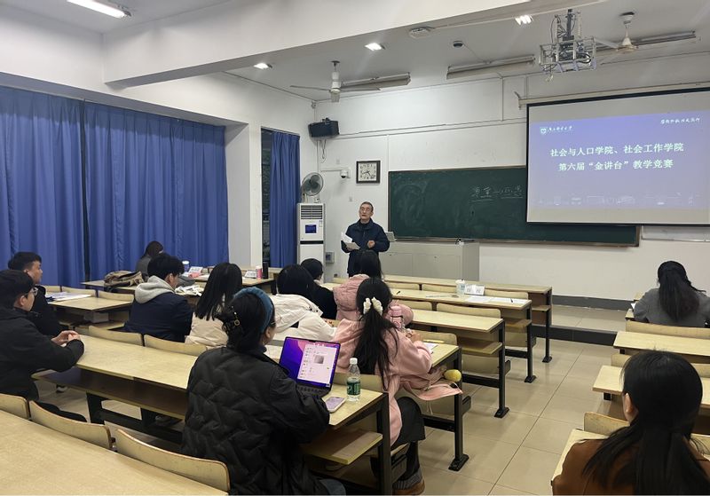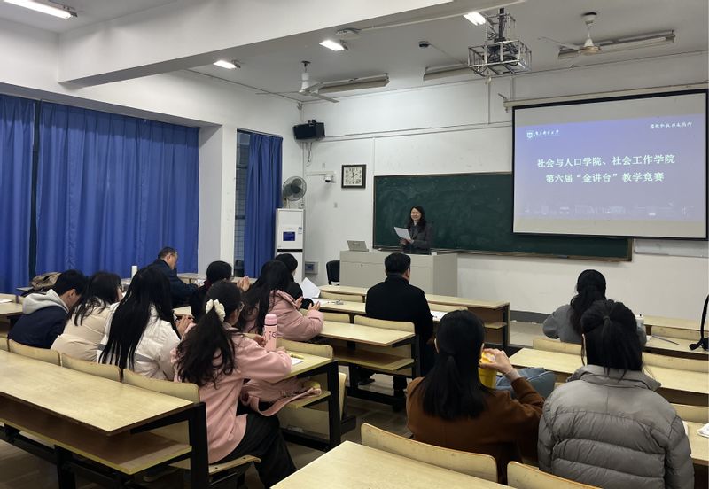 11月19日下午,社会与人口学院、社会工作学院在教2-103教室成功举办第六届“金讲台”教学竞赛。竞赛由学院副院长周晶晶主持,并邀请了南京中医药大学养老服务与管理学院产业学院建设办公室主任黄璜副教授,我校研究生院培养办主任兼卓越工程师学院副院长徐欣教授,学院关工委常务副主任、督导组组长庄国波教授,计算机学院院长助理、督导组组长胡素君副教授担任评委。学院青年教师现场观摩比赛。