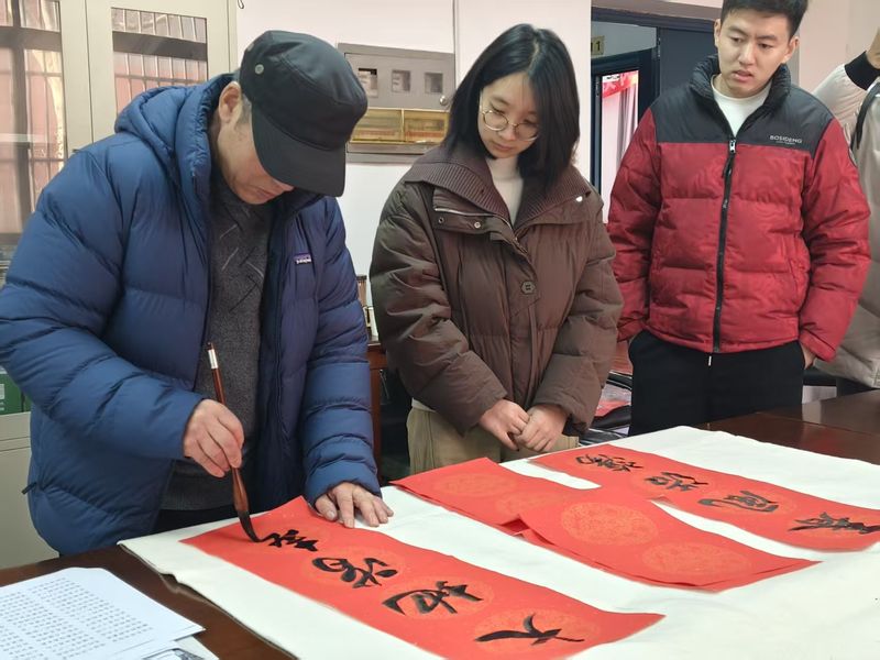 现场气氛热烈而温馨,院研究生会骨干与党支部的党员师生组成“志愿服务队”,簇拥在老师身旁观摩学习,将春联和“福”字整齐排列在地面晾干,不禁感叹:“亲眼看着书法家落笔,这种文化的鲜活感是印刷品无法替代的。看到这些字,浓浓的年味一下子就有了。”