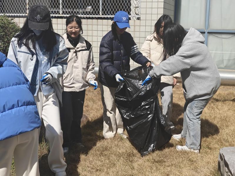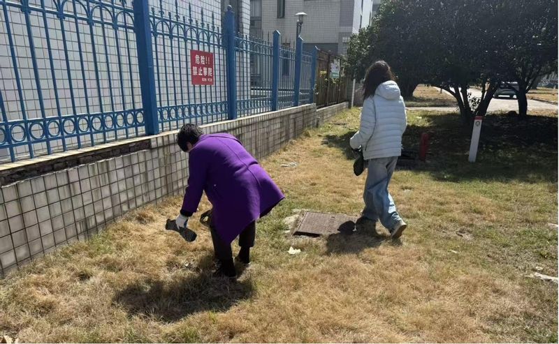 活动伊始,张慈萍老师便率先拿起工具,带领学生党员们投入到苑区环境清理工作中。在草坪区域,大家俯身细心捡拾碎石、清理白色垃圾,不放过任何一个卫生死角;在自行车停放点,师生齐心协力将杂乱停放的车辆逐一摆放整齐,使苑区通道变得井然有序。张老师一边劳动,一边与同学们亲切交流,分享自己年轻时的劳动故事和育人感悟,勉励大家“小事见精神,平凡显担当”。