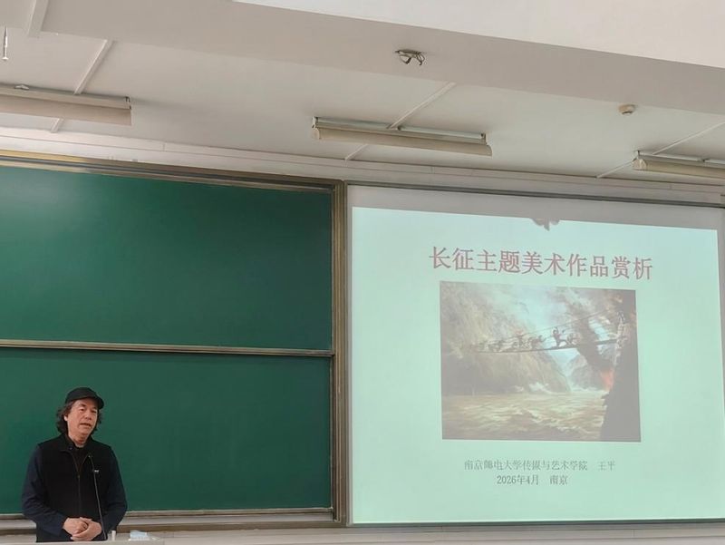 王平教授以深厚的艺术功底和真挚的情感,带领同学们开启了一段“红色艺术之旅”。他结合长征主题经典美术作品,从构图、色彩、光影、人物塑造等专业角度出发,深入浅出地分析了作品的艺术表现力,同时生动讲述了作品背后波澜壮阔的历史事件与感人至深的精神力量。通过一幅幅红色经典画作,长征精神如春风化雨般浸润学生心灵。最后,王平教授寄语菁英班全体学员:要将长征精神内化于心、外化于行,树立远大理想,锤炼过硬本领,拒绝“躺平”与浮躁,在实现个人价值的奋斗中,始终与国家民族的发展同向同行。